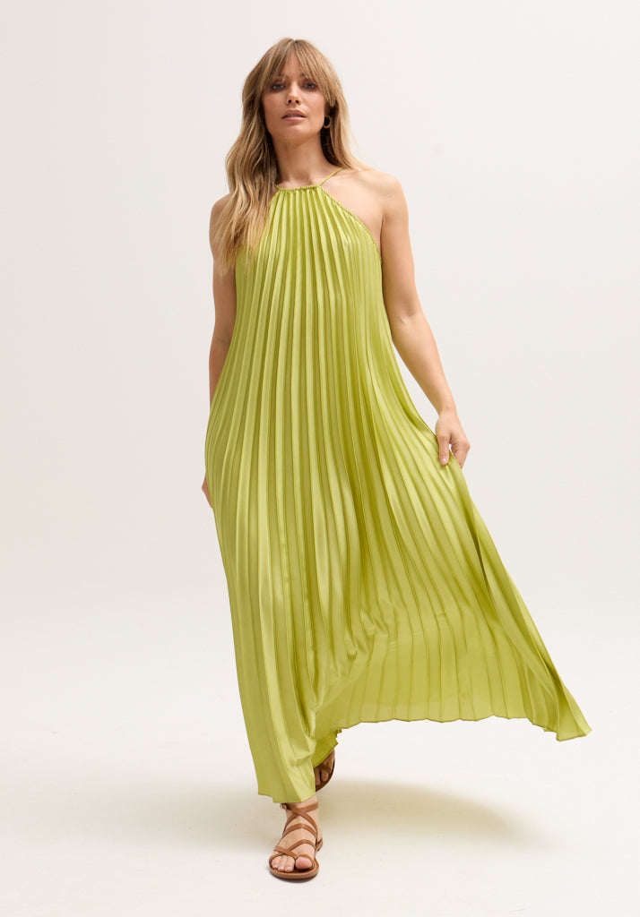 The Philomena maxi dress in green is a floor-length masterpiece featuring a flattering halter neck design that beautifully frames the shoulders. The delicate pleats create fluid movement, enhancing the dresses luxurious feel.